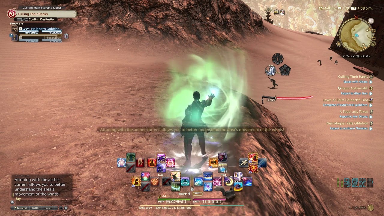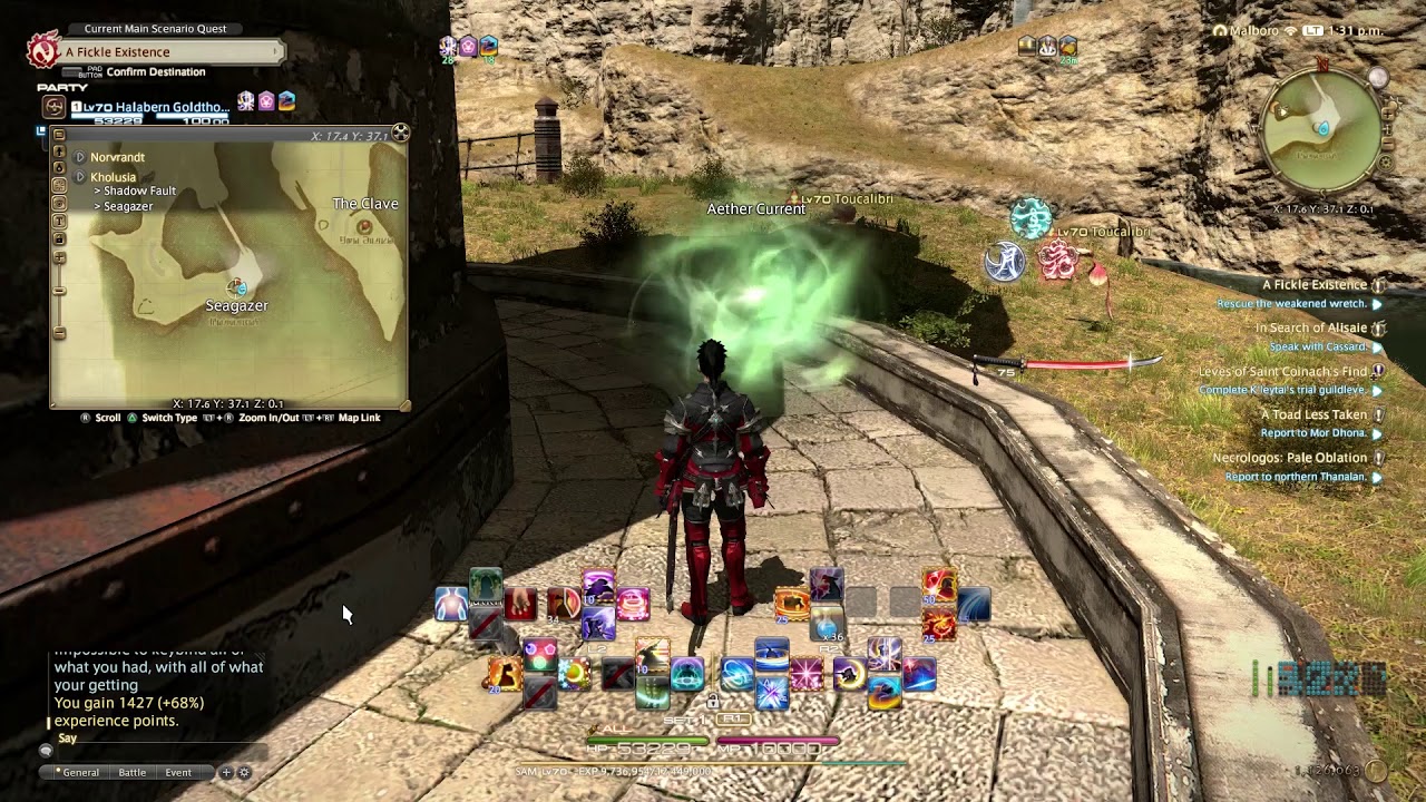 Another feature that made leveling easier was the fact that aether currents were not gated behind story content like they were in Stormblood. You could access all the attuneable currents the moment you set foot in the zone, other than the ones that were quest rewards. This allowed players to fly quite early on. The downside to this was that the currents weren’t placed in very “fun” spots. In Stormblood there were at the top of tall towers that player had to hop from ledge to ledge to get too, or across a narrow beam. At the very least they were very high up. In Shadowbringers, they were generally just thrown in random places and were not hard to get to or a challenge in any way.